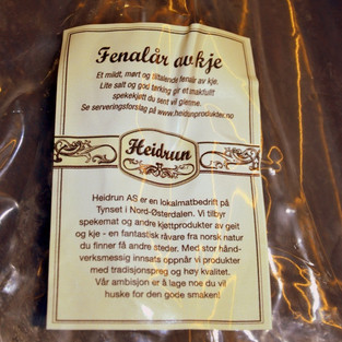 Kortreist mat er i vinden. Vi har også blitt mer bevisste på hva vi spiser og hvor det kommer fra, og velger gjerne de nære produsentene når det er mulig. Heidrun er en familiebedrift som holder til like i nærheten av oss. Lars og Anne Ragnhild Rønning produserer aldeles nydelig kjøtt av kje, altså fra geitekillinger. De prøver seg stadig frem med nye produkter, hittil er de kanskje mest kjent for pinnekjøtt og fenalår, men de har bl.a. også ulike pølser og sadel av geit. Produksjon av geitekjøtt krever at killingene kastreres før de kommer i brunst, ellers blir kjøttet rett og slett uspiselig. Det er det ingen fare for hos Heidrun, kjøttet de produserer er kjempegodt, og vel verdt en smak eller flere. Forøvrig liker jeg godt prinsippet i det å bruke bukkekillinger til noe så bra. Alternativet for disse små nyfødte hadde vært å bli avlivet og destruert med det samme. Det er nemlig tradisjonelt ikke vært marked for kjekjøtt i Norge. Nå klarer knapt Heidrun å levere så mye kjøtt som etterspørres. Heldige er vi derfor som bor nært og har mulighet til å stikke innom når disken er fylt. Bor du i Osloområdet, kan du få tak i produkter fra Heidrun på gourmetbutikken Jacobs, og det serveres også Heidrunkjøtt på Røros hotell og på Savalen hotell.